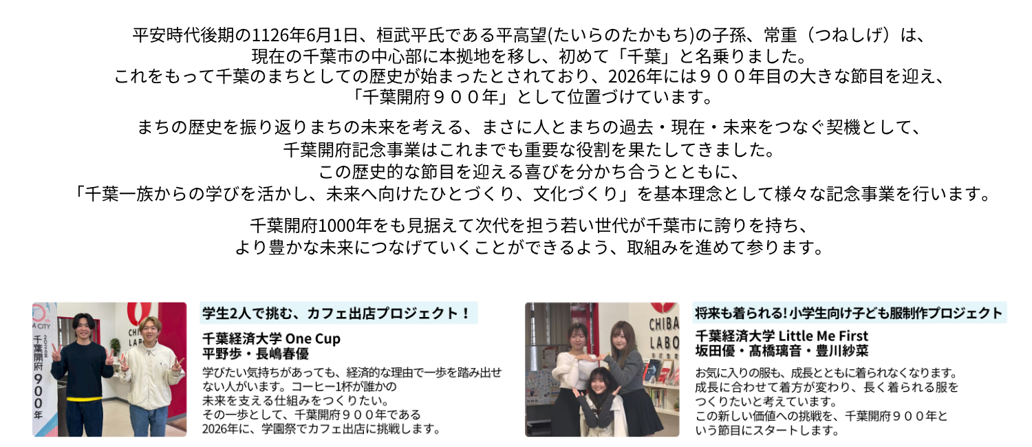 千葉市は、2026年に「千葉開府900年」を迎えます。未来へ向けた「ひとづくり」が記念事業の大きなテーマです。まちのこれからを担う若者や新たな事業に挑戦するチャレンジスピリットを持った方々のやりたい、実現したいを千葉市が支援します。本特設サイトでは、千葉開府900年に向けて若者たちが挑戦するクラウドファンディングプロジェクトを紹介します。