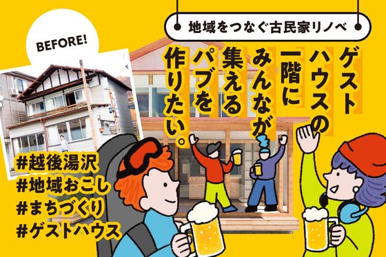 スノーリゾート新潟県湯沢町で「冬以外は人が来ない」という課題に一石を投じたい。そんな想いで、築70年の空き家を再生し、宿&スタンドパブ「軒の灯」を作ります。目指...