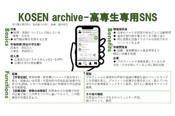 現在、他高専同士の交流が少ない状況にあります。このSNSでは、全国の高専生に質問ができたり、企業による採用PRを掲載したりすることで進路に困る高専生を減らすこと...
