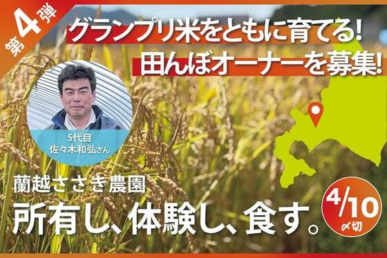 北海道蘭越町にある「蘭越ささき農園」の美味しいお米をよりたくさんの人に知ってもらいたい、お米が育つまでのストーリーを共有したいという想いから、田んぼのシェアオー...