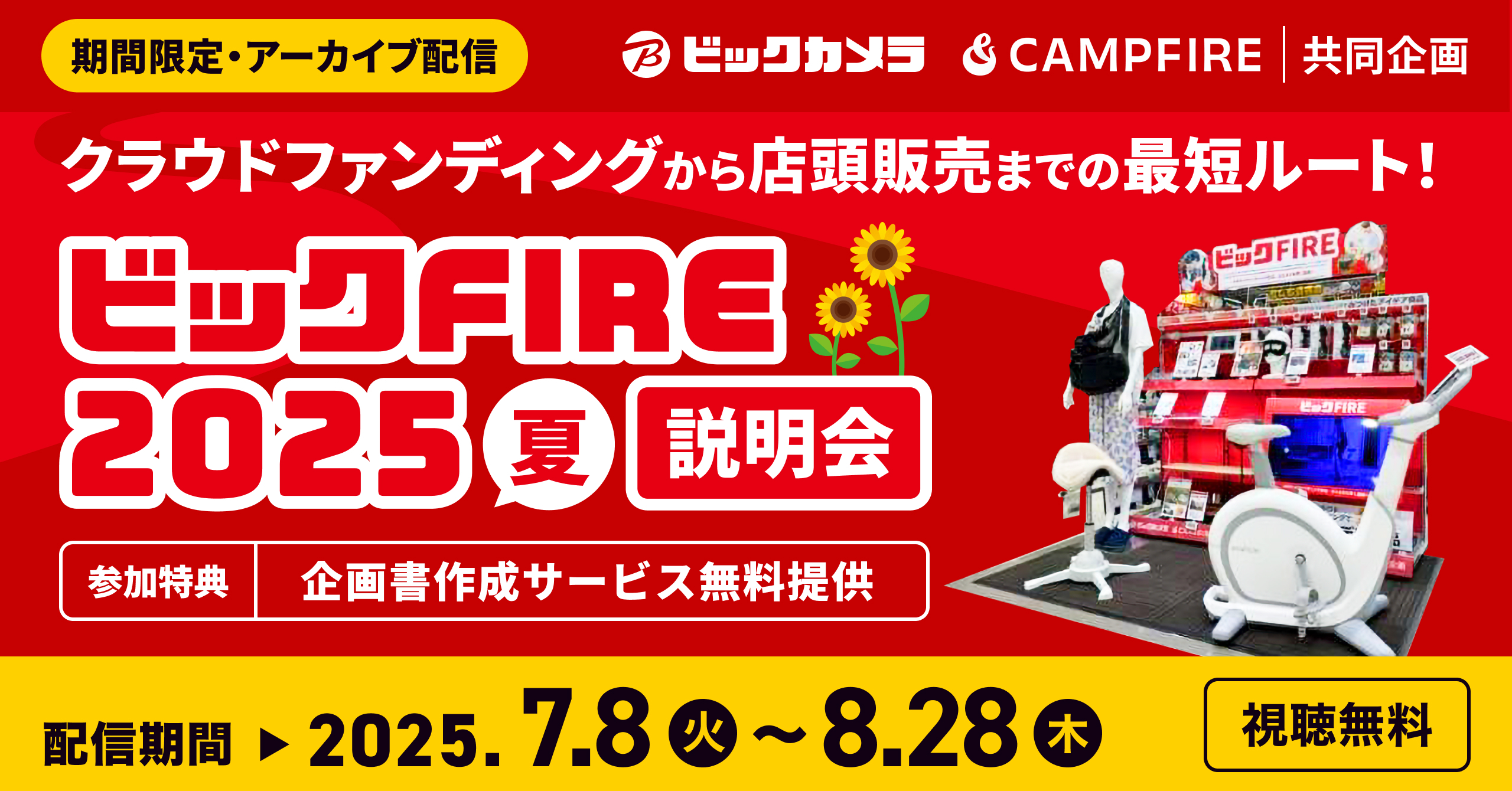 ・タイトル:【期間限定・アーカイブ配信】CAMPFIRE ・ビックカメラ共同企画「ビックFIRE2025(夏)」説明会〜クラウドファンディングから、店舗販売への最短ルート!〜