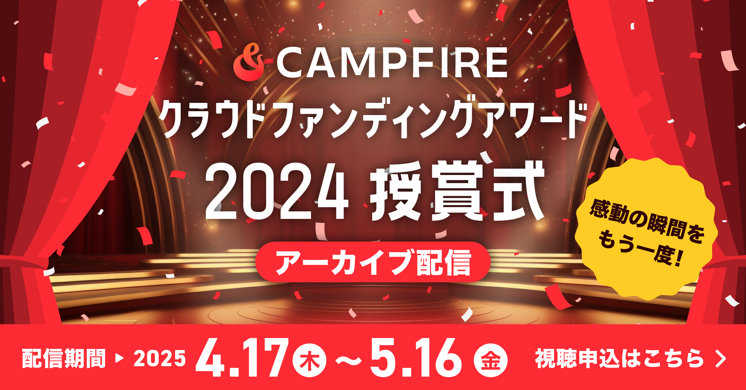 本アーカイブ配信は、2025年3月5日(水)に開催された「CAMPFIRE クラウドファンディング アワード 2024」の「授賞式」の様子を一部編集してお届けします。クラウドファンディングで素晴らしい挑戦を成し遂げたプロジェクトを称えるこのイベント。受賞したプロジェクトの背景や想い、クラウドファンディングの可能性を感じられる特別な映像です。支援を集めた秘訣や、共感を得る戦略など、次の挑戦のヒントにもなる内容となっています。