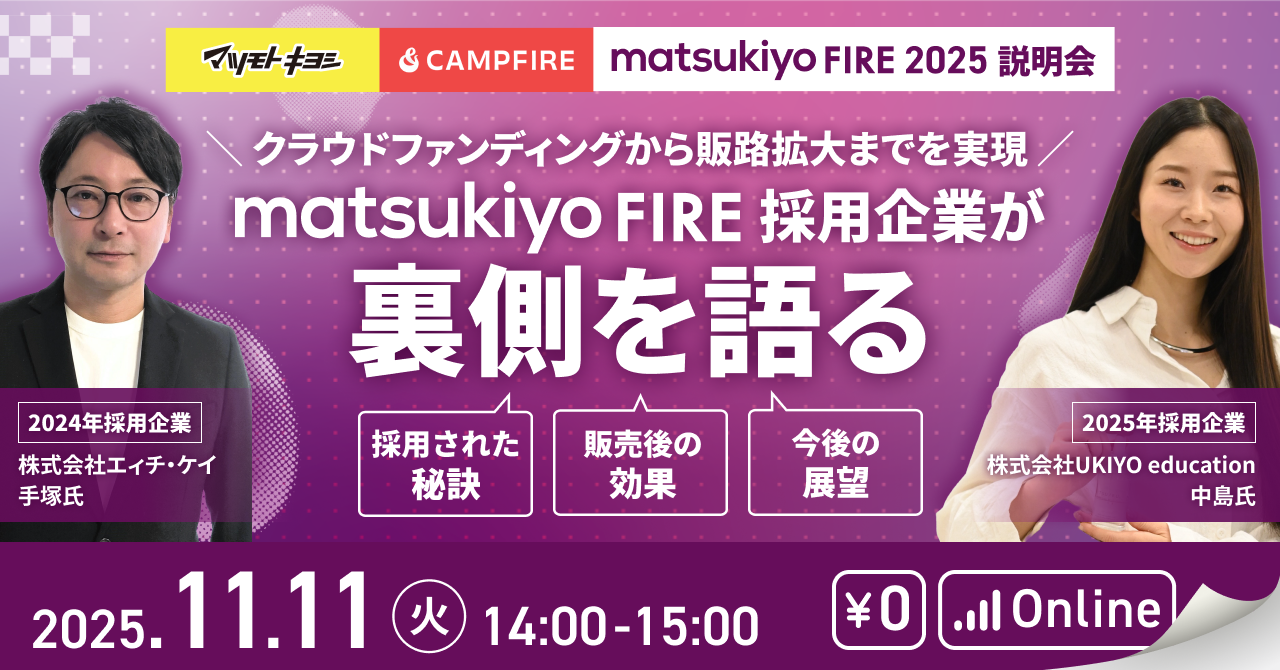 ・タイトル: マツモトキヨシ・CAMPFIRE 共同企画「matsukiyoFIRE2025」説明会〜クラウドファンディングから、販路拡大まで一気通貫でサポート!〜