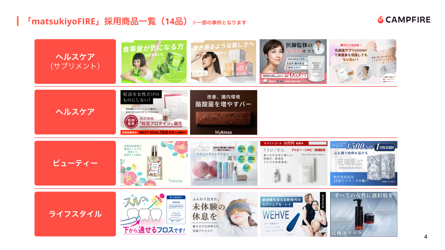▼matsukiyoFIRE 採用商品の事例集(全14品)