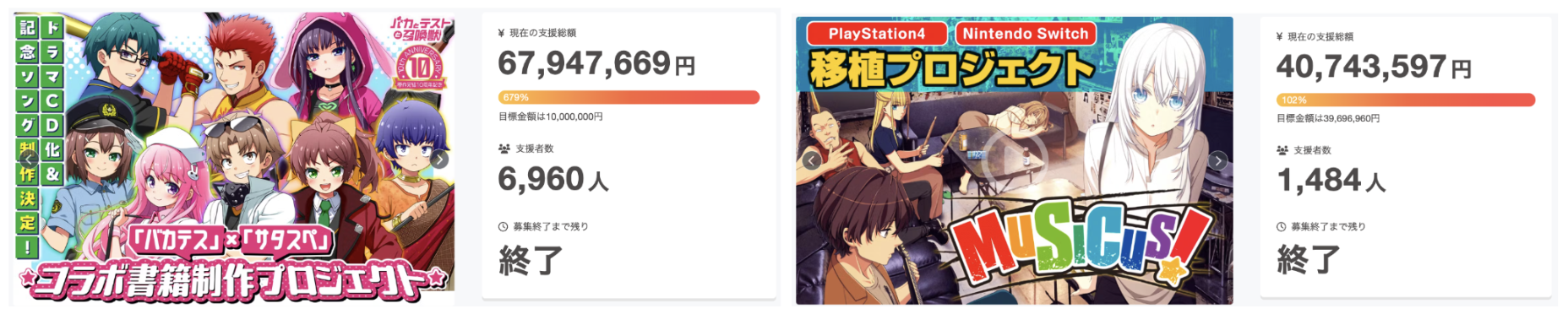 「バカとテストと召喚獣」「MUSICUS!」などのアニメ・ゲーム案件を手がけ、累計の支援総額は8.7億円を突破しました!