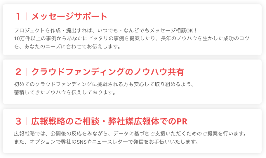 ※オプションにて「サクセスサポート」をご利用いただけます。プロジェクトを成功に導くには、多くの企画設計や施策設計が重要です。本サービスでは、経験豊富なキュレーターが専属担当として、公開準備から実施後のフォローアップに至るまで、実務全般を全面的に伴走いたします。