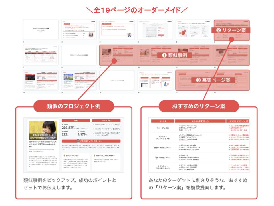 「クラウドファンディング企画書の決定版」とも言える本サービスで、クラファンへの第一歩をお手伝いします!