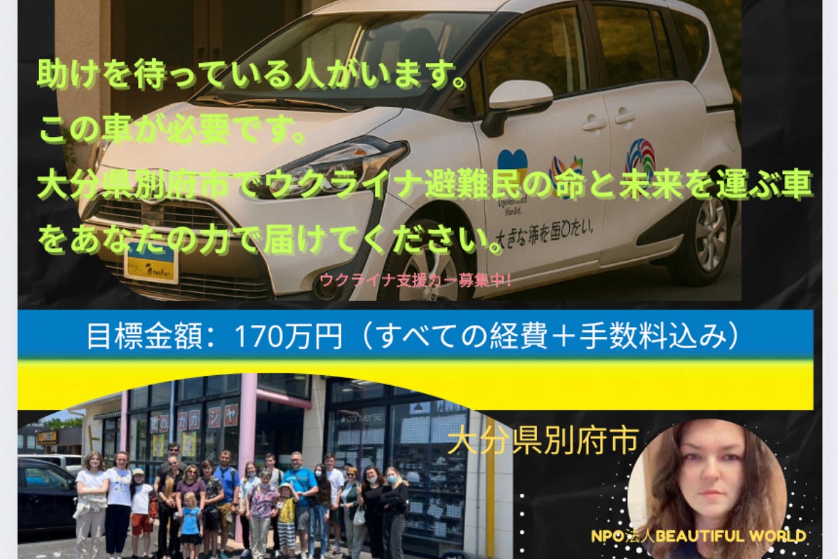 ウクライナ避難民の支援を行うNPO「Beautiful World」の活動のため、中古車の購入費を募っています。高齢者や病気の方々を安全に送迎するために、車が必...