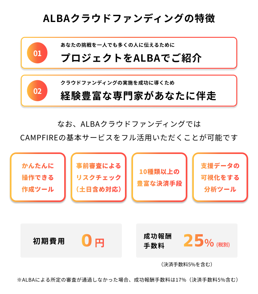 CAMPFIREは、お客様がこのフォームに送信された情報を、以下記載の通り株式会社ALBAとの間で共同利用いたします。