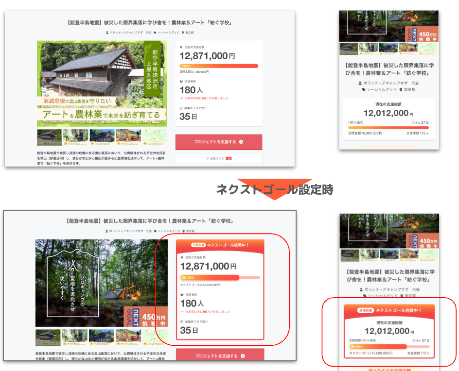 「達成したからこそ取り組める次の一歩」や、「本当はここまでやりたい」というプロジェクトオーナの理想のゴールを、クラウドファンディングのページの中で伝えやすくなります 。