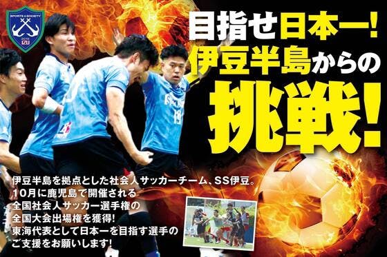 伊豆半島を拠点とする社会人サッカーチーム「SS伊豆」です。2016年の東駿河湾3部リーグ参入から【5年連続のリーグ優勝と昇格】を続け、静岡県史上最速で「全国社会人サッカー選手権」の全国大会出場を勝ち取りました!クラブ史上初の全国大会で日本一を目指すSS伊豆の挑戦を応援いただけると嬉しいです!
