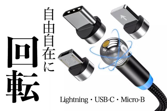 ①先端が360°自由自在に回転!②急速充電に対応!③Lightning・USB-C・Micro-B端子に対応!