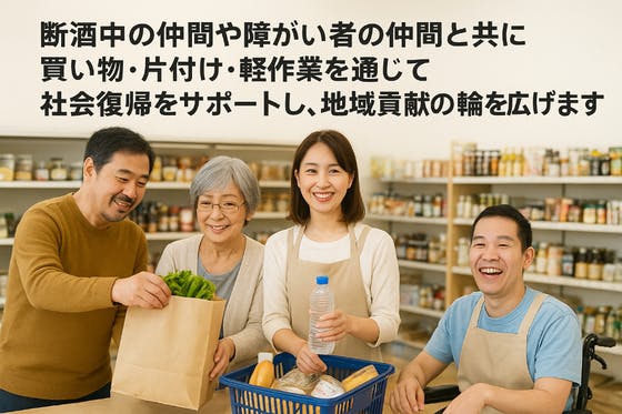 断酒中の仲間や障がい者の仲間と共に買い物・片付け・軽作業を通じて社会復帰をサポートし、地域貢献の輪を広げます。活動拠点は守口市、2026年4月予定です。