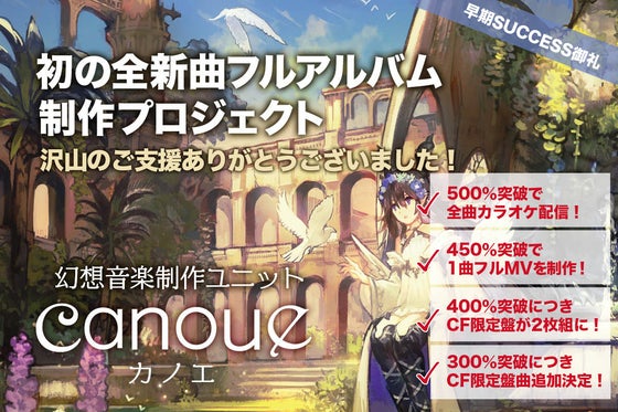聴き手を幻想世界へと誘う数多くのファンタジー音楽作品を紡いできたユニット「canoue(カノエ)」最新作となる全曲書き下ろしフルアルバムを、ファンの皆さんと共に...