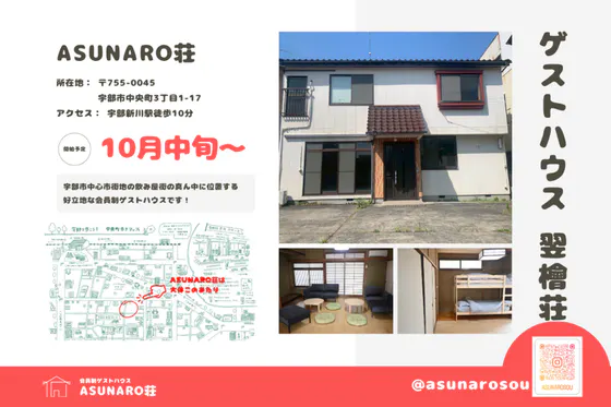 宇部新川駅から徒歩5分の場所に会員制ゲストハウス「ASUNARO荘」がオープンします。コンセプトは、「明日なろう」という志を持った同志が集う令和のトキワ荘です。...