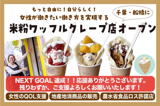 【100万円達成!ありがとうございます!】 女性がもっと自由に、自分らしく働ける社会を目指して! 2024年9月、京成線・大神宮下駅近くに米粉ワッフルクレープ...