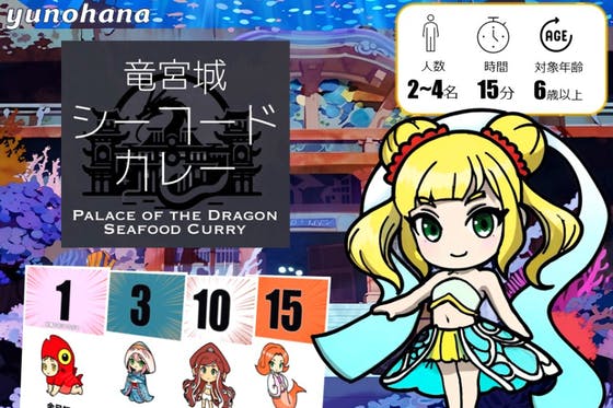 竜宮城に住む乙姫が、カレーで作るために海の仲間を捕まえるゲーム『竜宮城シーフードカレー』神経衰弱をベースで、5枚連番で引いた人が勝利するカードゲームです。
