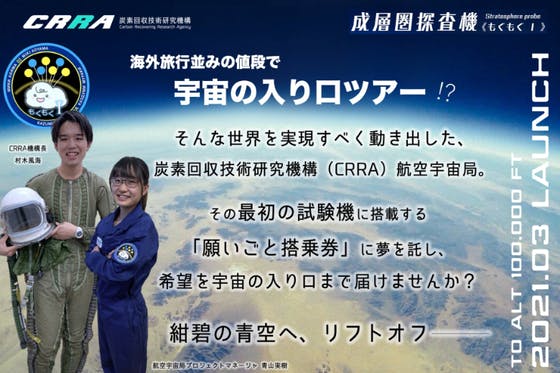 高度3万5000m上空、成層圏へ。スぺースバルーンに代わる全く新しい次世代成層圏探査機《もくもくI 》を開発し、みなさんの夢や願いごとを宇宙の入り口までお届け!...