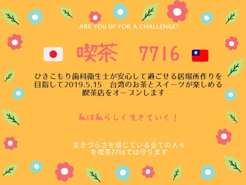 ひきこもり歯科衛生士が台湾のお茶とスイーツのお店を開業します!☆2019.5.15オープン☆生きづらさを抱えている人々が安心して過ごせる居場所を作りたい。生きる...