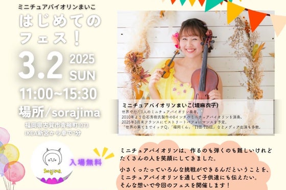 2025年3月2日(日)11:00~15:30 ミニチュアバイオリンを通して、ちっちゃくても色んなことに挑戦できることを子供たちに伝えたい。 ミニチュアバイオリ...