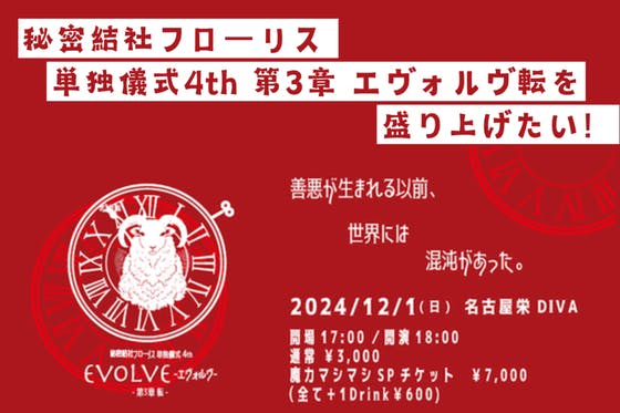 12/1に栄DIVAで開催される、秘密結社フローリス 単独儀式(ワンマンライブ)を華やかに彩るお手伝いをお願いします!ご支援いただいたお金は、フラスタや花束、運...