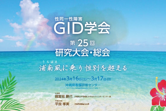 GID(性同一性障害)学会第25回研究大会・総会 テーマ:浦南風(うらはえ)に乗り性別を超える 会 期:2024年3月16日(土)~17日(日) 会 場:沖縄県看護研修センター(沖縄県看護協会) 〒901-1105 沖縄県島尻郡南風原町字新川272番地17