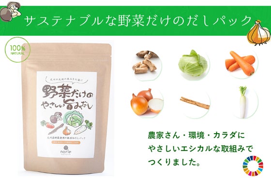 普段ロスされがちの椎茸の軸の部分を活用し、キャベツ・たまねぎ・だいこん・にんじん・ごぼうなど全部で6種類の九州産野菜だけをつかったサステナブルなだしパックをつく...
