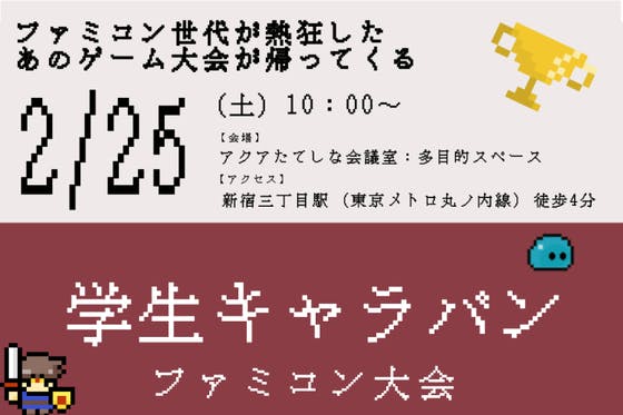 新宿のレンタルスペースをお借りし、そこでファミコン大会を開催し、 16連射で話題になった有名シューティングゲームでスコアアタックを行います。 多数のファミコンソ...
