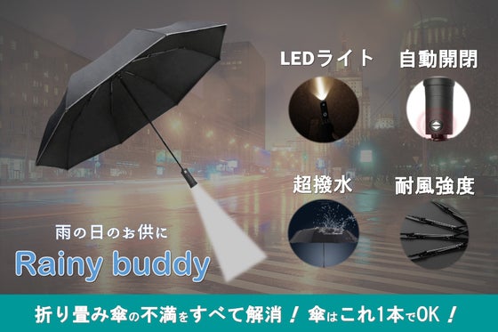 折り畳み傘の不満をすべて解消!軽量・超撥水・自動開閉・強風耐性。さらに夜も安心に使えるLEDライト付き。長傘いらず。傘はこれ1本でOK!面倒な折り畳みもワンプッ...