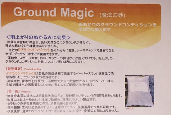 本製品はぬかるんだグラウンドに散布し土と撹拌するだけで乾いた状態になります。原料は古紙ですので、環境にやさしいものです。現在、社会人、大学、高校野球チームやグラ...