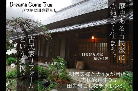 古民家田舎暮らしの夢を諦めず初老の私でも出来るところを観て頂き、若い人達だけではなく皆さんに夢や目標達成に向かってのきっかけになればと思い応援をお願いする事にな...