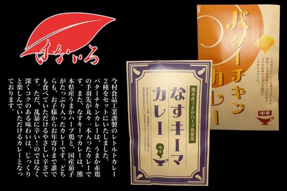 今村食品工業様が監修した、「バターチキンカレー」は、うまか赤鶏の手羽先が丸々一本入ったカレーです。また、「なすキーマカレー」は、熊本県産うまかハーブ鶏と、国産茄...