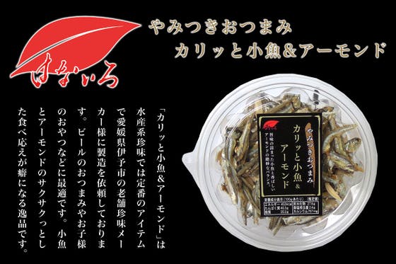 カリッと小魚&アーモンドは、水産系珍味では定番アイテムで、愛媛県伊予市の老舗珍味メーカー様に製造を依頼しております。ビールのおつまみやお子様のおやつなどに最適で...