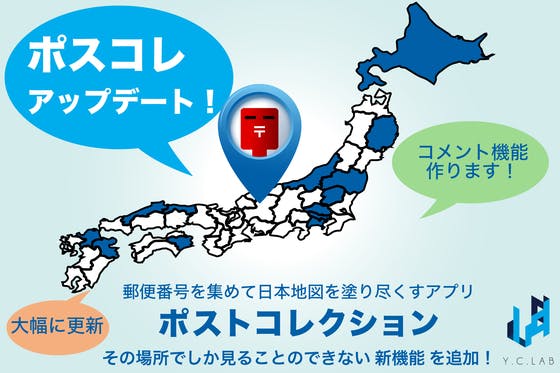 郵便番号を集めて日本地図を塗り尽くすアプリ「ポストコレクション」のアップデートを行います。その場所でしか見たり書いたりすることができない、掲示板を新たに作成しま...