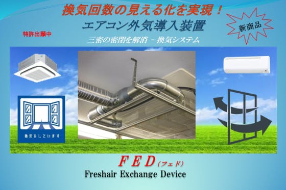エアコン外気導入装置「FED」既存 エアコンの室内空気吸込み口に外気を取り込むダクトを設け、室内の空気の入れ替えを強制的に2回行う装置です。学校、オフィスビル・...