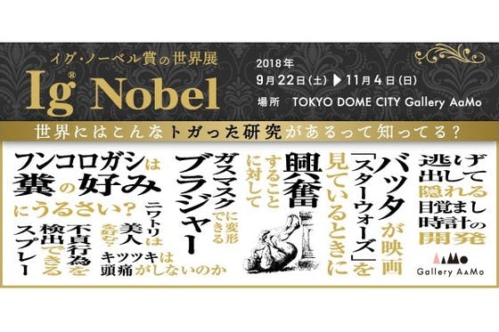 皆さんは「イグ・ノーベル賞」をご存知ですか?世界初の「イグ・ノーベル賞」公式展覧会が、2018年9月22日(土)~11月4日(日)に東京ドームシティ Gallery AaMoにて開催決定。受賞研究の紹介や体験コーナーなどでイグ・ノーベル賞の軌跡を知りながら、笑わせ考えさせられるような展示会です。