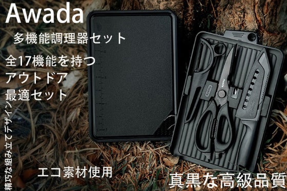 17機能を持つアウトドア用の多機能ツールセット。三徳包丁、はさみ、皮むき、収納ボックス式まな板等、様々な用途に対応。収納ラックと砥石付きで整理保管と刃物の手入れ...