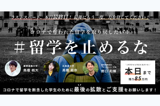 新型コロナウイルスの影響により、学生は97%もの留学の機会を奪われました。私達は、そんな学生達に対し、学びの機会を届けるべく、「#留学を止めるな」をテーマにクラ...