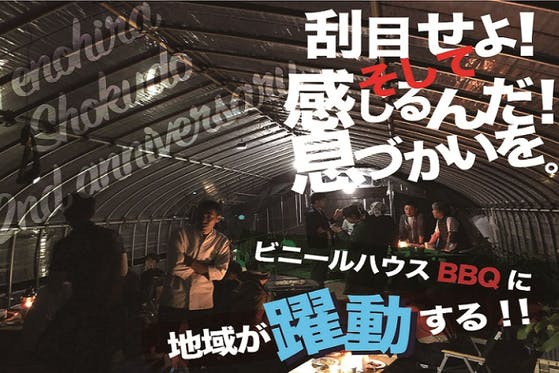 こんなBBQ見たことありますか!?テントはビニールハウス!テーブルはトラックの荷台!灯りはランタン!なんとバーベキューコンロは一輪車!!会場は畑や田んぼの近く!...