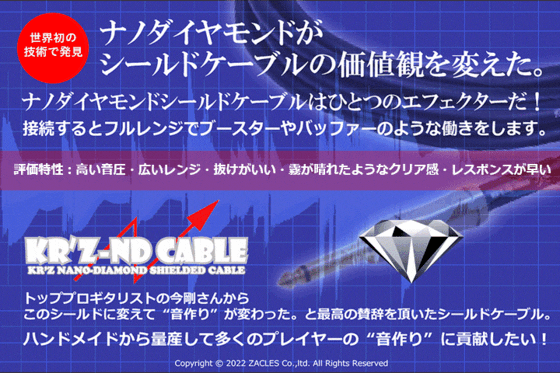 ナノダイヤモンドがシールドの価値観を変えた!接続するとフルレンジでブースターやバッファーのような働きをします。ナノダイヤモンドシールドケーブルはひとつのエフェク...