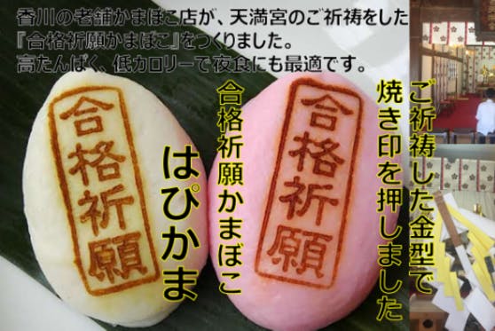 創業60年の香川のかまぼこ店が、受験生を応援する為のかまぼこを開発しました! 学問の神様『滝宮天満宮』で、しっかりとご祈祷頂いた金型で『合格祈願』の文字を焼き...