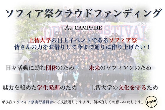 日々活動に励む団体のため、上智を目指す未来のソフィアンのため、魅力を秘めた学生の発掘のため、上智大学の文化を守るために、コロナ禍でも可能な限り充実したソフィア祭...