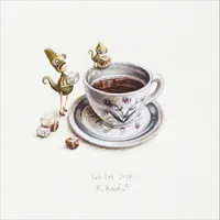 主に透明水彩を使い、少し贅沢で不思議な世界を細密に、落ち着いた色彩で丁寧に表現している。 平面作品を中心に、絵本やアニメーション作品、キャラクターの模型などを制作。 また、『ティーカメレオンデスク』という作品を展示するためのデスク(オリジナル書斎)を制作し、展示空間ごと絵の中の世界を表現する。 Born in 1991, Kashima is a young and next generation's artist based in Osaka. He is good at expressing heartwarming, pampering and charming wonderlands with his great precise and careful touch of brushing technique using transparent soft color water paints. Throughout variety of artistic talents on illustrations, children's books, animations and character figures, he represents his own world.