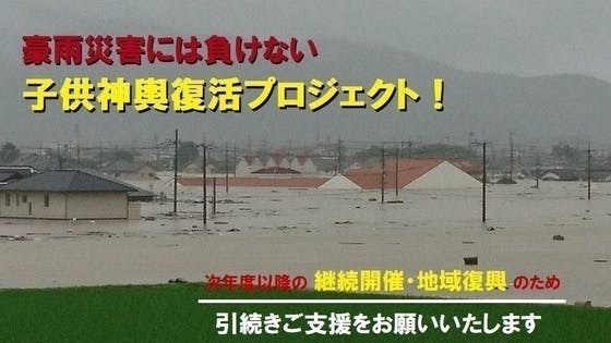 平成30年7月豪雨災害で、岡山県倉敷市真備町の小田川堤防決壊により子供神輿の備品が水没し、子供神輿が開催できない状況です。被災した子供達の笑顔と地域の活力を取り...