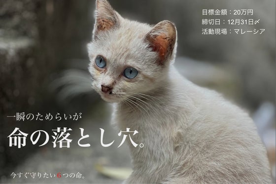 マレーシアで助けを必要とする子猫に出会うことが増え、自分たちにできる範囲で6匹を保護し治療を続けています。医療費が限界に近く、これ以上の保護・TNR・里親探しを...