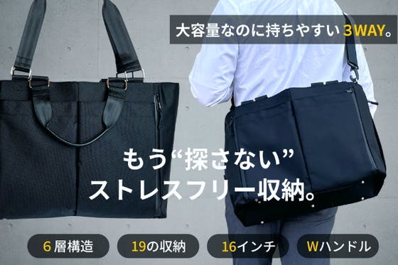 通勤も休日もこれひとつ!ダブルハンドル×ショルダーの3WAY仕様。16インチPC対応の6層構造・19ポケットで大容量かつ快適収納。濡れ物専用ポケットやスマホをサ...