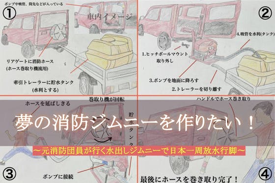 今まで日本全国どこにも存在しない小型消防ポンプ積載ジムニー。このプロジェクトでその特別なジムニーを作りあげ尚且つそこに水利(貯水タンク)も付けその場で放水可能と...