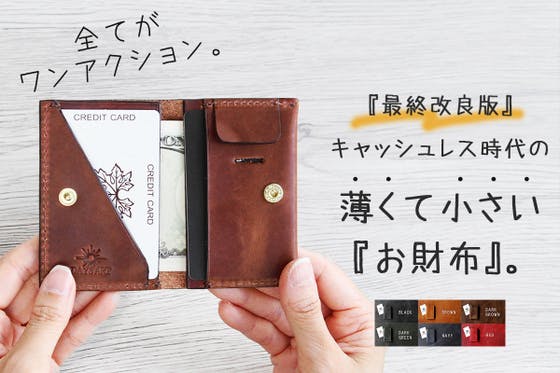 厚み約9㎜!ユーザーの声から出来たキャッシュレス時代に欲しい[薄くて・小さい財布]最終改良版。ワンアクションで操作できるシンプルな構造とカードとほぼ変わらないサイズの圧倒的コンパクトさ!のお財布です。