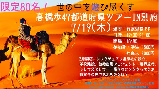 7月19日に約10年ぶりに別府に自由人・作家高橋歩がなんと別府に来ます! トークライブあり、映像あり、思いっきり本人と語っちゃってください! 自分の好きなこ...