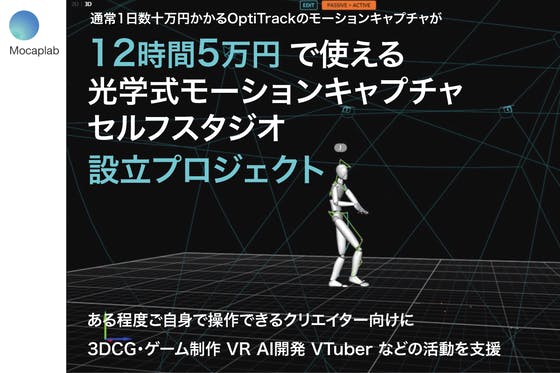『自分である程度機材の操作を覚えて使えるクリエイター向けに、光学式モーションキャプチャシステムが気軽に使えるようにすることで、創作活動や研究を支援する』がコンセプトの東京都内で圧倒的最安価格を実現する光学式モーションキャプチャセルフスタジオ設立プロジェクト。